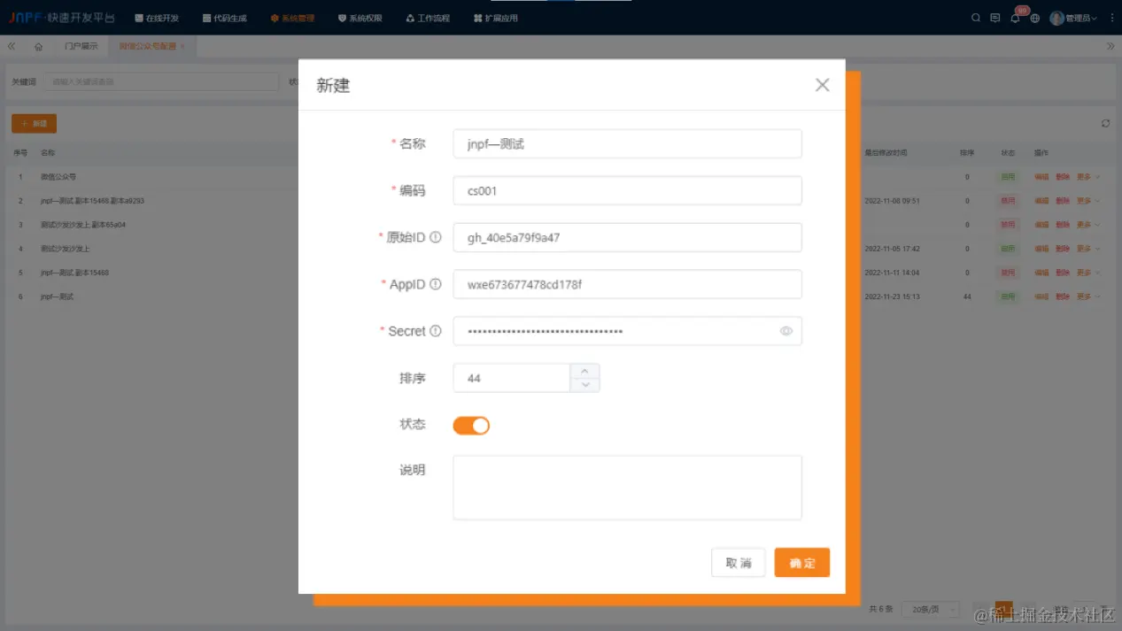 在新建窗口页面先对基础信息进行配置,如名称、编码。再对原始ID、AppID、Secre(以上三项皆可在“微信公众号管理后台-设置与开发-基本配置”页中获得)进行配置。