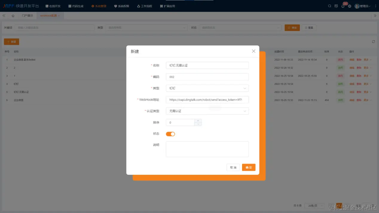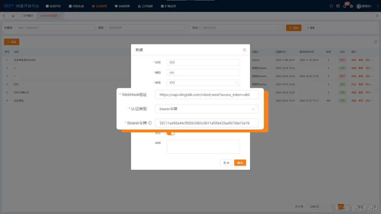 在新建窗口页面先对基础信息进行配置,如名称、编码。再选择需要的类型,支持钉钉及企业微信,对WebHook地址进行配置,选择认证类型,根据账号的实际应用需求,可选无需认证或者是Bearer令牌,若是认证类型选择了Bearer令牌,还需填写Bearer令牌的密钥。