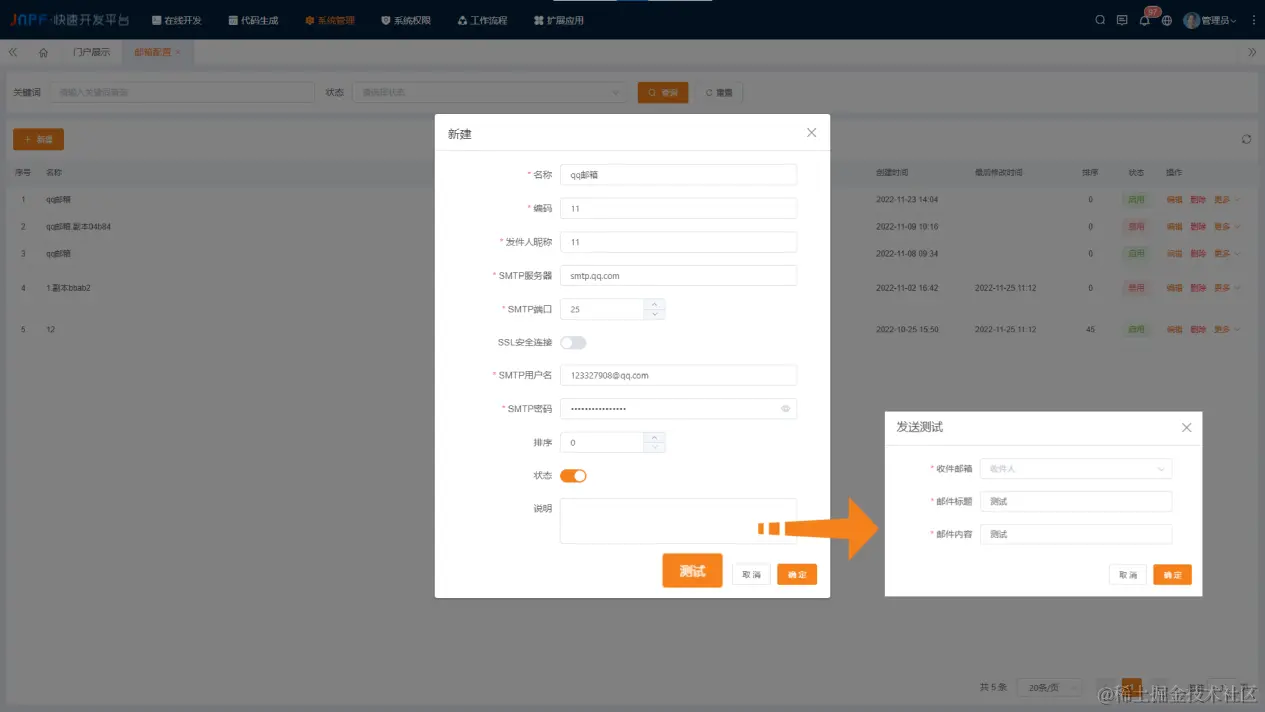 在新建窗口内填写所配置的邮箱账号的基础信息,如名称、编码及发件人昵称。同时需完成对SMTP相关信息的配置,包括SMTP服务器、端口、用户名、密码及选择是否打开SSL安全连接。