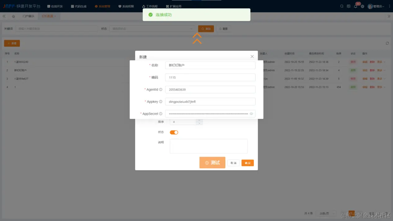 完成配置后,点击测试,可对已配置的钉钉账号进行发送测试,当测试连接提示,测试连接无误后再对钉钉账号进行提交,记录与【消息中心-消息发送配置】关联。