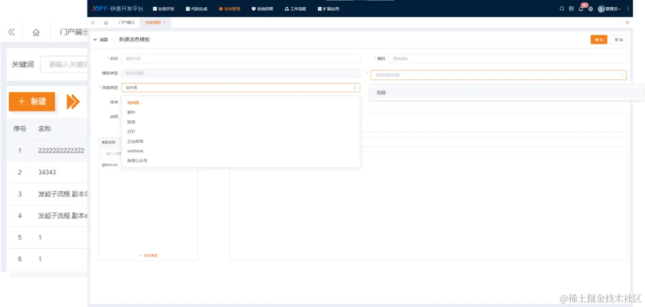 点击新建,即可进入新建消息模板页面,对消息模板进行配置,在完成基础信息的配置后,选择对应的消息类型,并在页面下方完成对于参数的新增以及消息标题及消息内容的填充。