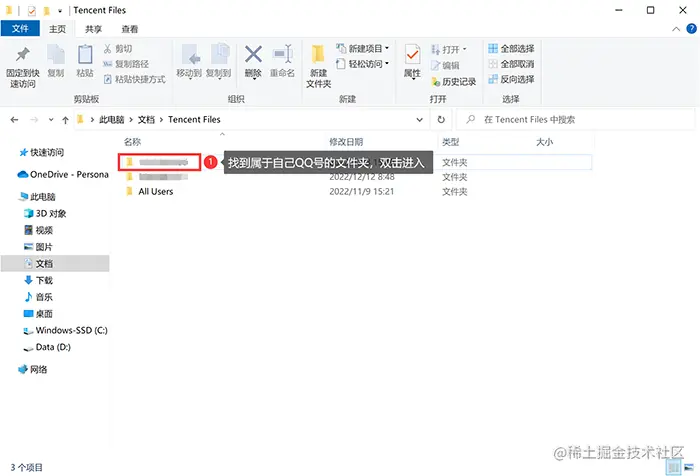 **步骤2:**进入后,找到文件夹名称为自己QQ号的文件夹,双击进入。