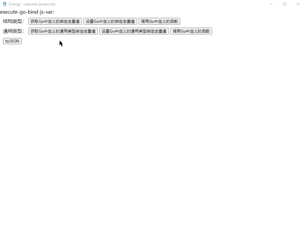 在Energy中不只可以调用 JS 和 事件机制,也可以通过Go绑定在Go中定义的一些变量函数在JS中调用,在使用的时候就如同在JS调用本身定义的函数一样方便。