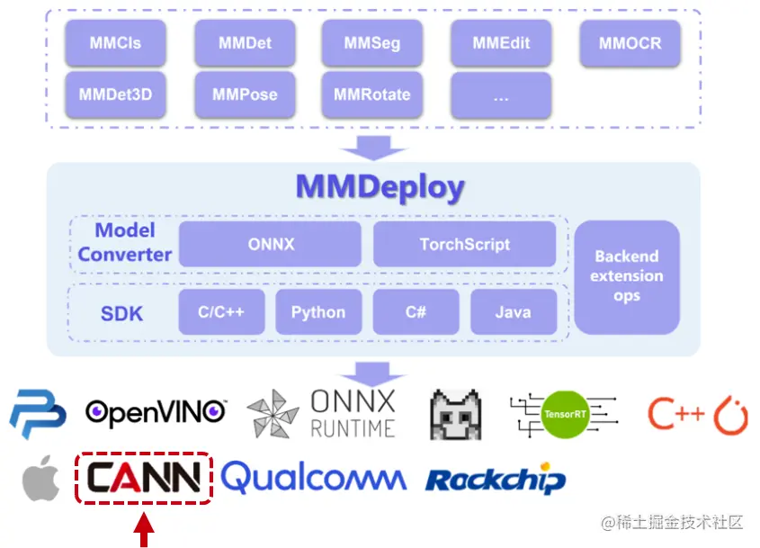 CANN具备灵活的框架适配度,也是昇腾高算力硬件的使能引擎,因此很自然地和MMDeploy走到了一起。CANN不但扩充了OpenMMLab算法推理后端,使能开发者基于MMDeploy和CANN快速构建AI应用和业务,还能充分发挥昇腾AI硬件澎湃算力,加速推理业务的执行。