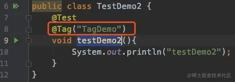 在testcasedemo.demo2.TestDemo2的方法testDemo2上加上注解@Tag: