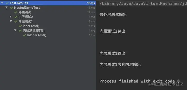 由测试结果可以看出,@Nested的执行顺序为先执行@Nested嵌套外层的用例,再以倒叙形式执行@Nested用例,然后再执行第二层嵌套的用例: