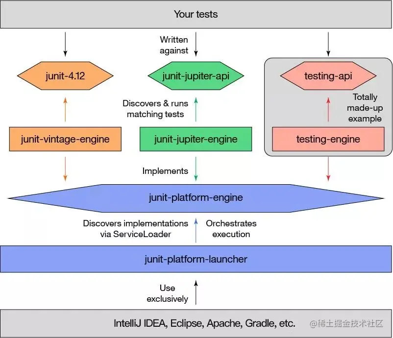 其主要作用是在 JVM 上启动测试框架。它定义了一个抽象的 TestEngine API 来定义运行在平台上的测试框架;也就是说其他的自动化测试引擎或开发人员⾃⼰定制的引擎都可以接入 Junit 实现对接和执行。同时还支持通过命令行、Gradle 和 Maven 来运行平台(这对于我们做自动化测试至关重要)