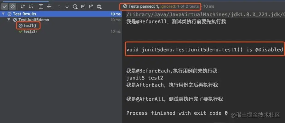5)在测试用例test1上加入注解@Disabled,使test1失
