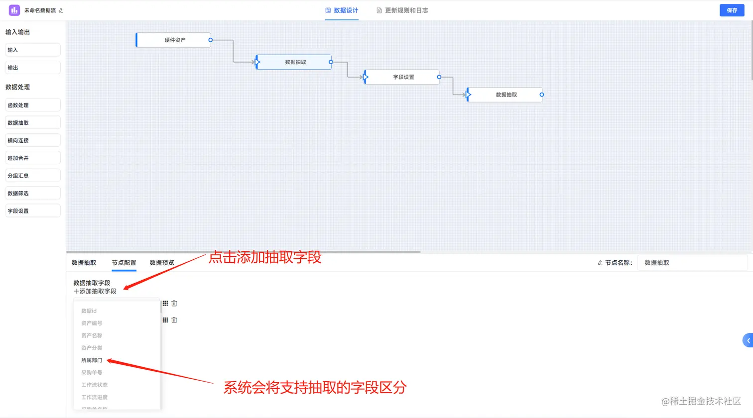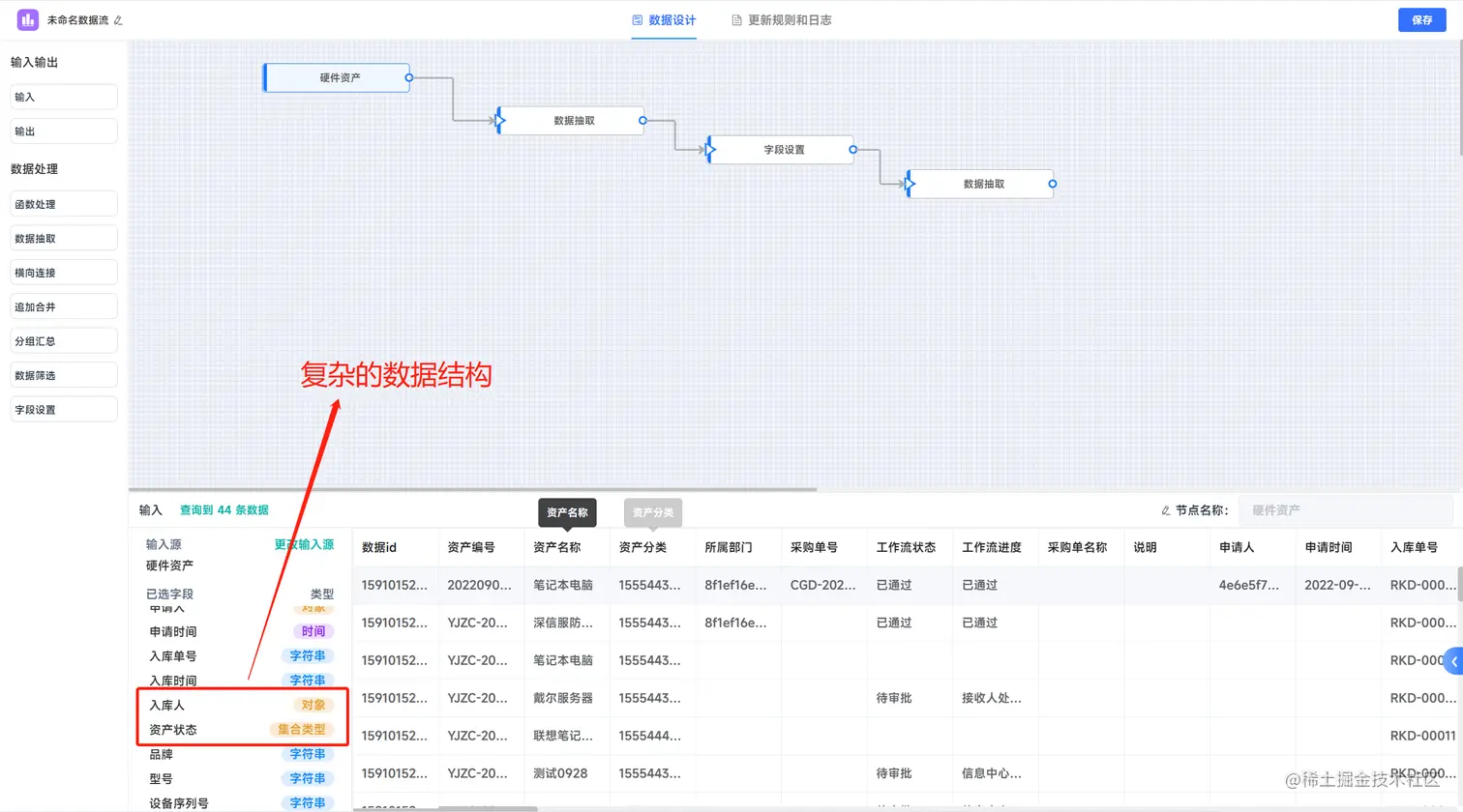 现在的数据库,逐步增加了字段存储的能力,可以是对象、可以是数组,那么对于这种数据类型的处理,数据智仓中增加的数据抽取的节点,就是将复杂的数据结构转化为普通的数据横表,这种便于我们简单的操作,例如分组聚合、条件筛选等。