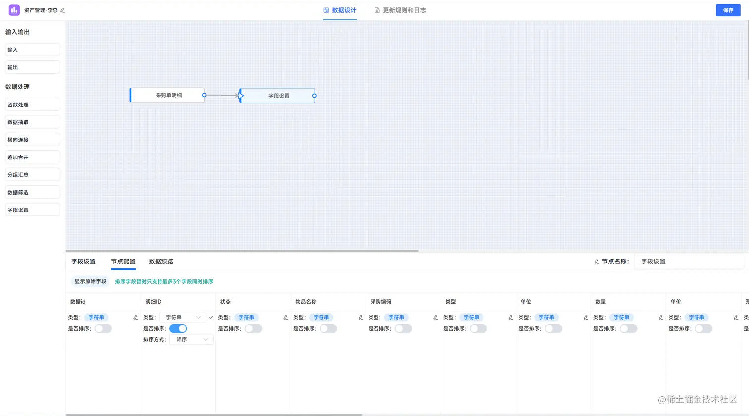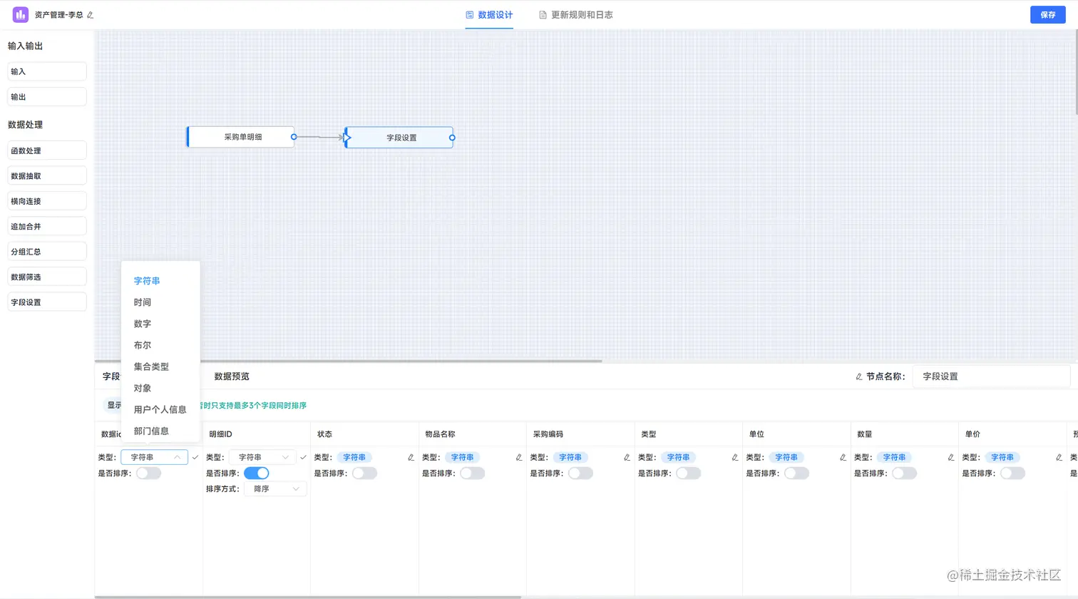 字段设置,即在数据智仓中,对输入上一数据处理节点的字段进行显示和隐藏、排序、重命名等操作。