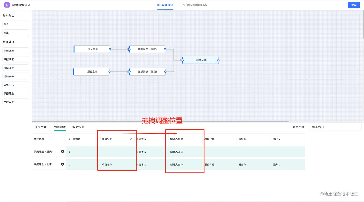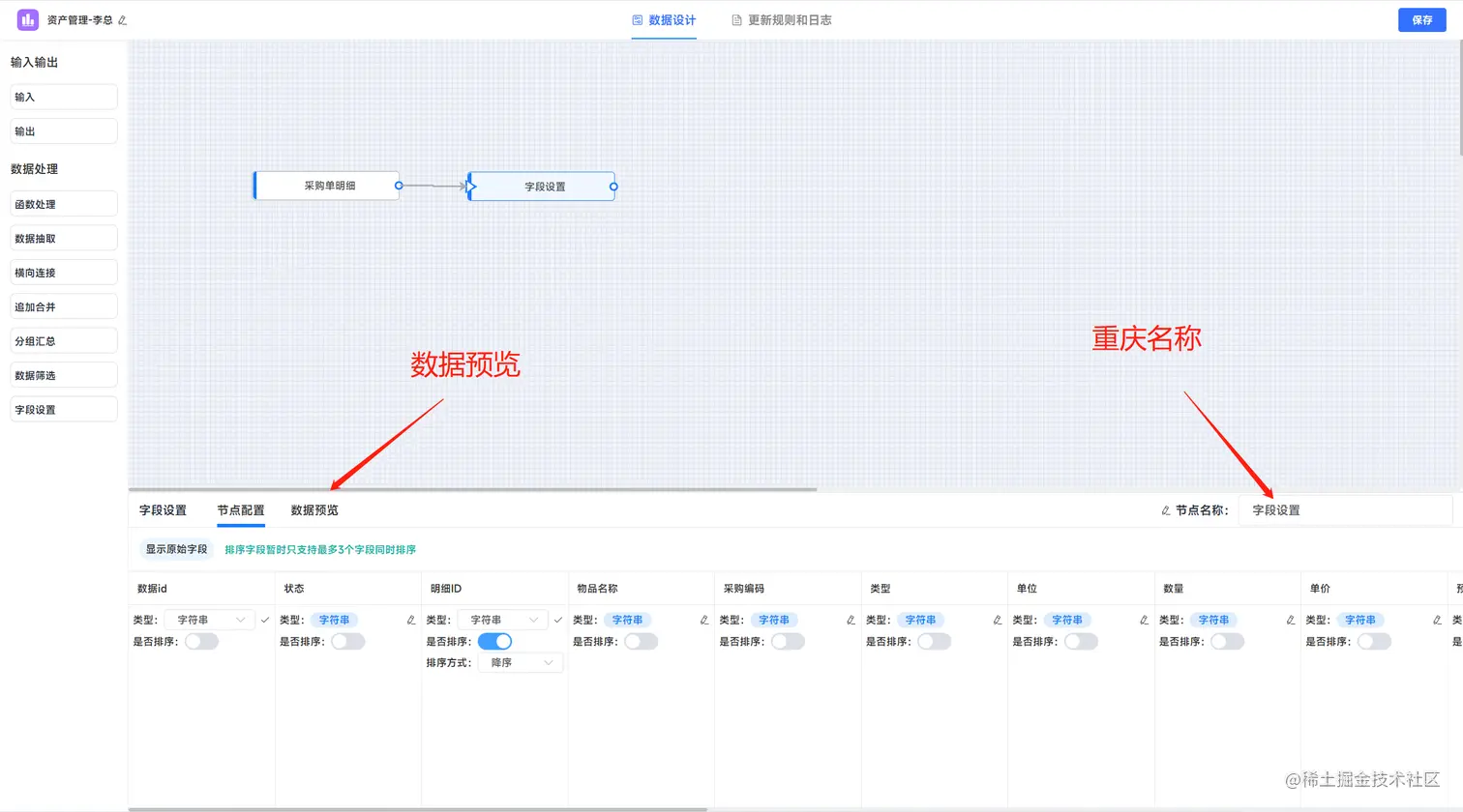 支持对字段左右拖拽排序,并支持数据预览与界面命名。