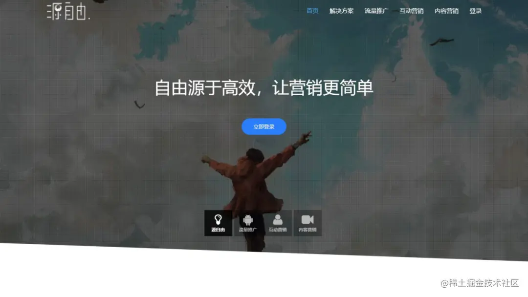 这个案例是我们之前做过的一个企业官网,主要展示"源自由"这个网站都有什么服务。通常企业网站在首屏会有一个大的banner做重点介绍。这里面还有菜单分布,菜单对应功能,登录后台功能等,这里不再赘述,主要给大家展示参考设计的元素。