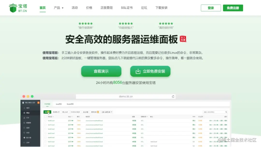 然后跟着宝塔提供的安装帮助,一步一步安装即可,宝塔提供傻瓜式的服务端软件部署方式。我们这里就不再展示宝塔的安装过程。大家可以直接到官网查询安装帮助即可。