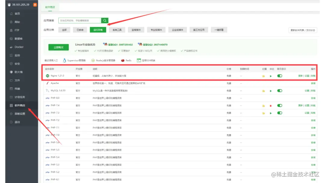 我们来看下怎样利用宝塔软件部署你的网站。输入你的服务器IP地址后登录到宝塔面板,到软件商店中找到nginx这个web服务端软件,安装并启动它。