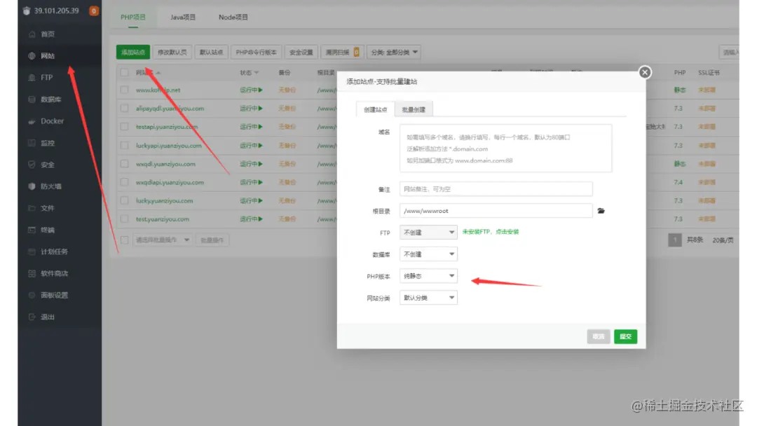 接着点击菜单网站,然后点击添加站点,就可以输入你的网站域名,然后点击提交你的网站就算创建成功了。