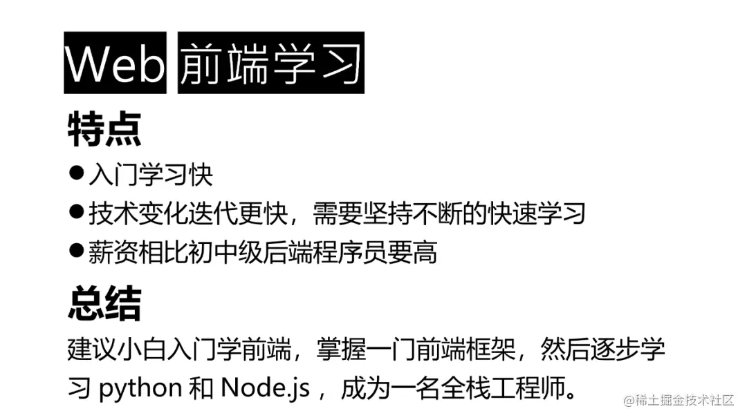 建议小白入门学前端,掌握一门前端框架,然后逐步学习python和Node.js,成为一名全栈工程师。