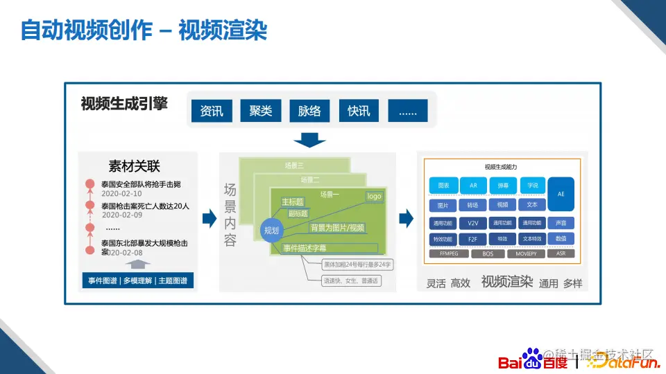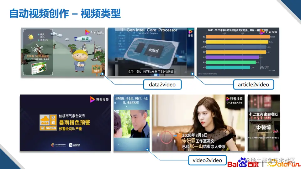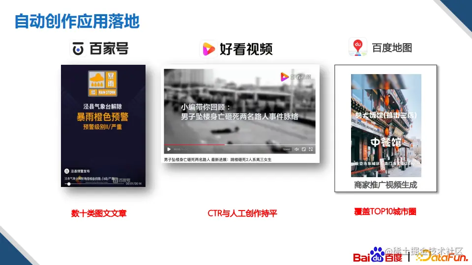 自动创作方面,我们在百度百家号落地了数十类的图文文章,借助视频创作引擎,我们在好看视频也落地了多种类型的视频作品,CTR达到了与人工创作持平,同时在百度地图落地了商家推广的视频产品。