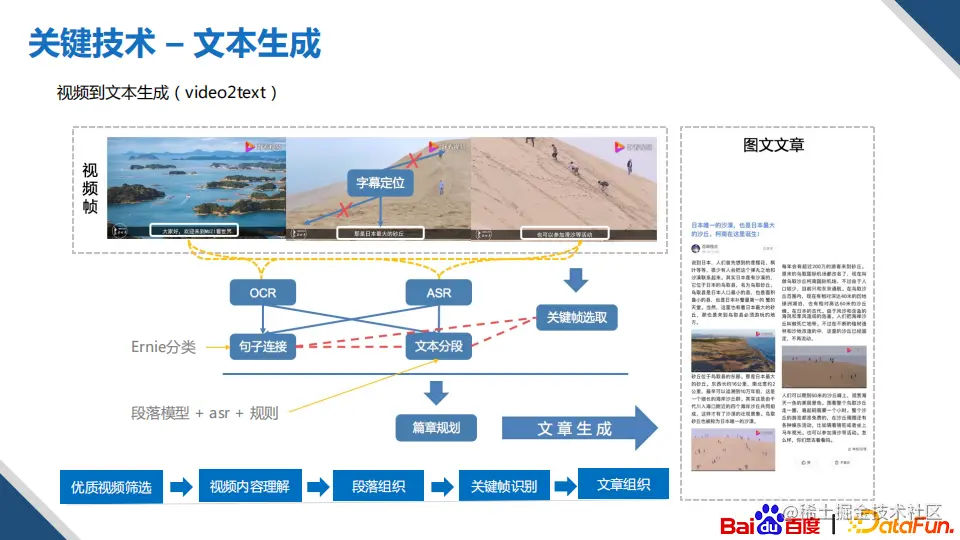 我们目前的方法当中会同时使用模型和规则。首先是做视频的理解,得到视频的一些感知数据,像ocr、asr相关的信息,为了确保文章的准确率,我们会使用ocr和asr做一个双向的校验,对输出的字幕会使用Ernie进行分类,最后结合每一段去选择对应的关键帧作为图片。有了文本和对应的关键帧作为配图,就可以按照这种时间的逻辑顺序生成一篇视频转写的文章。