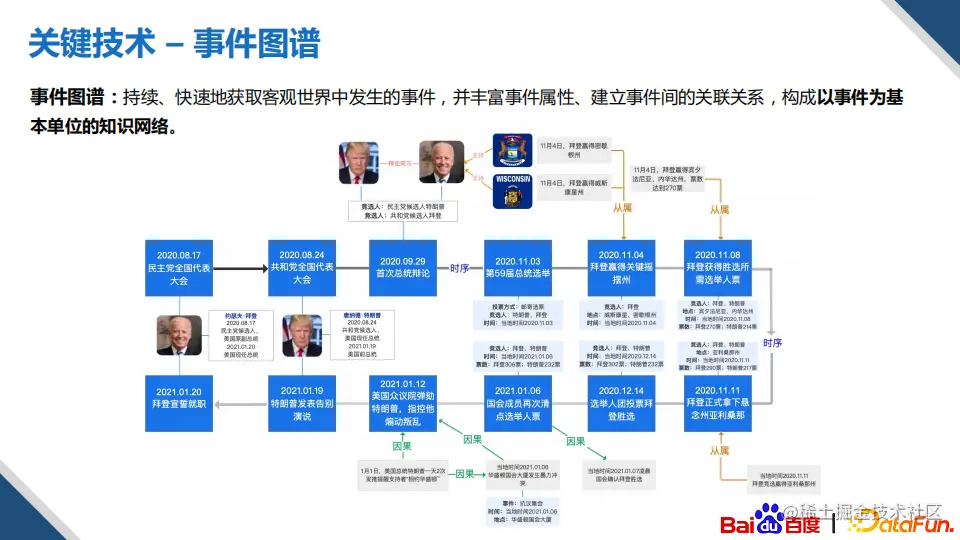我们的世界无时无刻不发生着事件、新闻资讯,绝大部分也都会包含事件。人的一些属性或者关系可能会随着时间发生变化,比如美国总统是谁这个问题,在2021年1月20号之前是特朗普,之后则变为了拜登。如果只是使用通用知识图谱,并不能得到这些动态变化的信息,而事件图谱可以很好地补充这一缺陷。