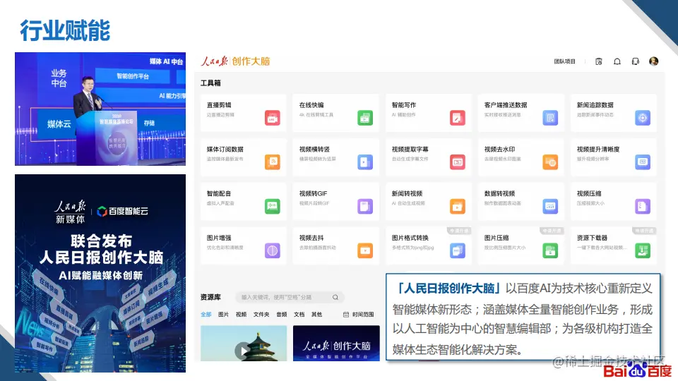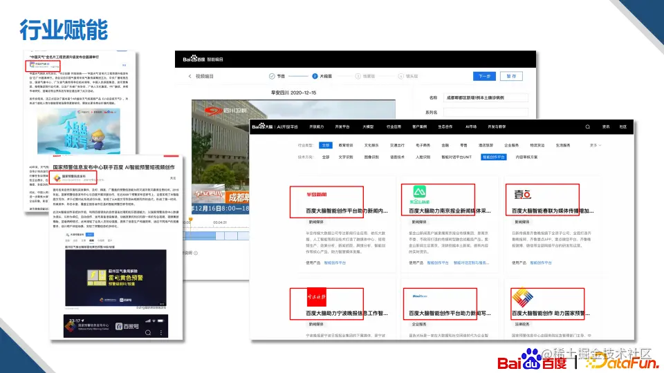 在行业赋能方面,自动创作上,我们和国家预警中心,中国天气网等部门进行了深度的合作;辅助创作上,我们支持了四川观察新闻视频的拆条和主题抽取的应用,以及多家省级媒体的辅助能力的落地。此外,在去年初我们还和人民日报达成了持续的合作,输出了多项创作的核心能力。