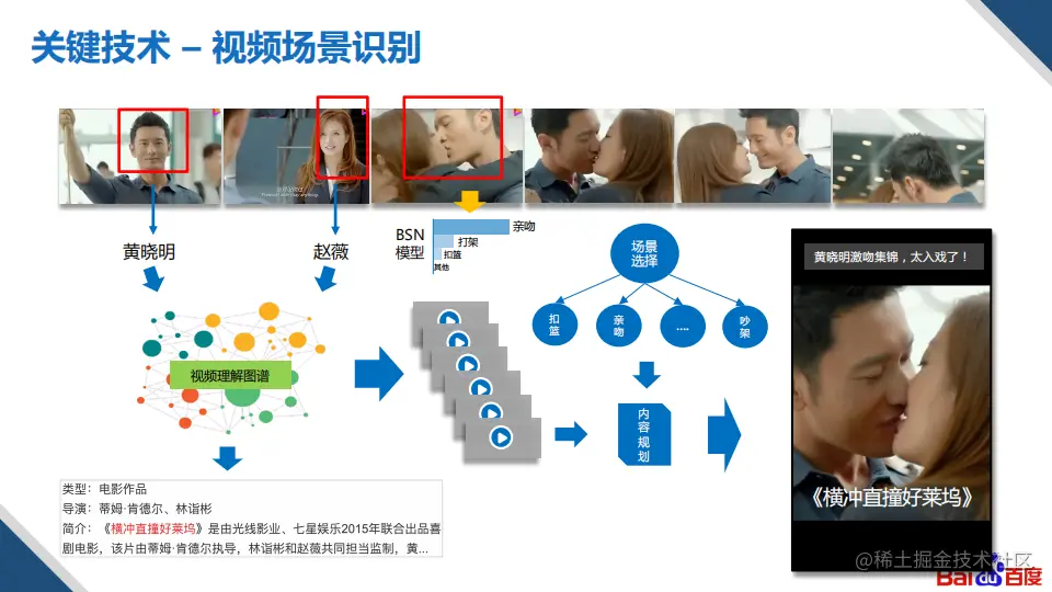 另外一个关键技术是视频场景识别,其在学界的研究对象主要是“时序动作提名”。在自动创作的时候,我们会从挖掘的信息中获取用户最喜欢观看的一些视频场景,然后对这些场景进行抽象。比如我们发现像亲吻、扣篮、打斗等场景都是用户喜欢的类型。因此,我们就基于时序动作提名的算法来进行包含该动作场景的一些识别和检测。当识别出这些场景之后,结合视频理解图谱,就会得到当前视频片段所属的影视剧是哪一个,这样就相当于对每个视频进行时序上打标签。有了这些标签之后,可以把需要的视频片段进行整合,通过一定的构建策略,生产精彩集锦类的视频。