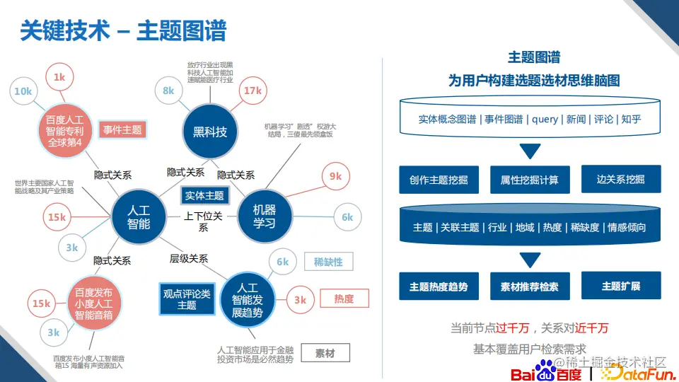 上图左边的这张图中,大的节点代表一个主题,蓝色的是实体主题,红色的是事件主题,每个主题都有相应的素材、热度、稀缺度、行业和地域等属性,主题之间的边关系包括了实体的spo关系、事件的从属关系以及更为抽象发散的隐式的关系。上图右边的这张图是主题图谱的构建过程,首先我们是以实体、事件图谱、query、新闻等作为基础数据,然后进行主题、属性和边关系的挖掘,最后为用户提供按照热度、稀缺度进行主题素材的推荐和检索,另外还能够基于边关系进行主题的扩展。