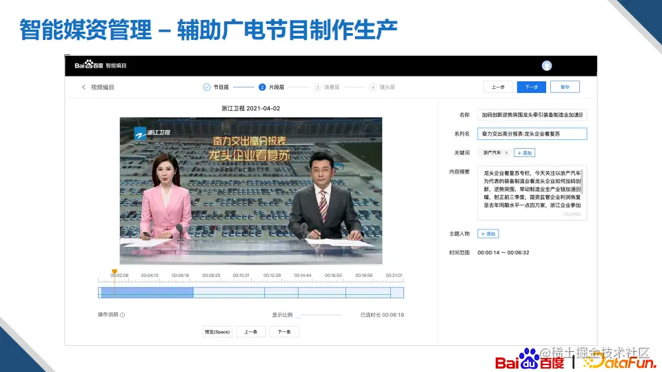 辅助创作的另外一个比较有价值的应用是媒资智能管理,简单来说就是帮助各个媒体进行视频的拆条、编目、标注的能力。拆条就是对一个完整的视频进行分割,像新闻联播,它可以分为很多的独立的片段,拆条的力度可以是片段级、场景级、镜头级;编目就是对拆条后的视频进行总结的描述。