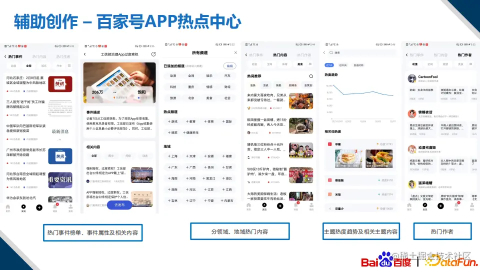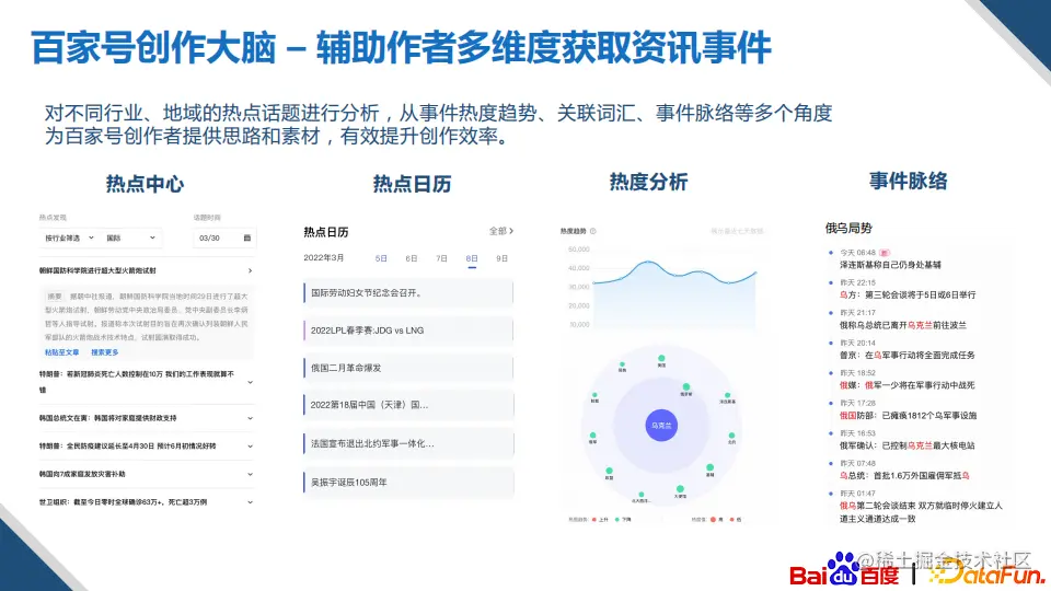 辅助方面,在公司内部,我们支持了百家号APP的多项创作能力,例如热点分析、热门推荐、主题趋势等。