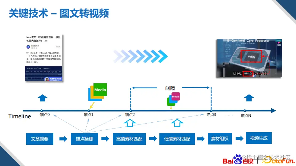 - 其次需要对摘要后的文本进行锚点选择,锚点就是摘要后的一些比较关键的信息片段,比如上图例子中“英特尔”就是一个比较关键的锚点,这样做主要的原因是生成视频的素材输入大部分情况下都很少,比如可能就2-3张图,我们要把最相关的素材给到用户关注度最高的时间点上;