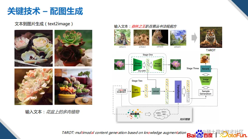 除了文本生成,我们还探索了文本到图片生成,这是一个非常有应用价值的技术,它除了可以生成各种类型的图片,还能够帮助公司去避免图片版权相关的一些问题。对这方面技术了解的同学,应该都看过DALL·E的生成效果,可以说是非常惊艳的,但仍存在一些问题,比如图片分辨率较小,图片质量不是特别高,所以是不可以直接落地使用的。另外,在真实的场景下,作者检索图片时,输入的往往都是概念,而DALL·E更偏向于对确定性实体进行细节性描述。所以我们的做法是,首先使用VQ-GAN代替了DALL·E的VQ-VAE,并且提高了图片生成的分辨率。上图多肉植物图片,可以看到,质量是非常高的;然后结合知识图谱让模型学习到更多的和抽象概念相关的知识,保证模型能够理解人类常识性的概念,在右上角这个示例中,可以看到,当输入的是“森林之王”时,模型依然可以很好地生成对应的实体,而且质量上相对也更好。