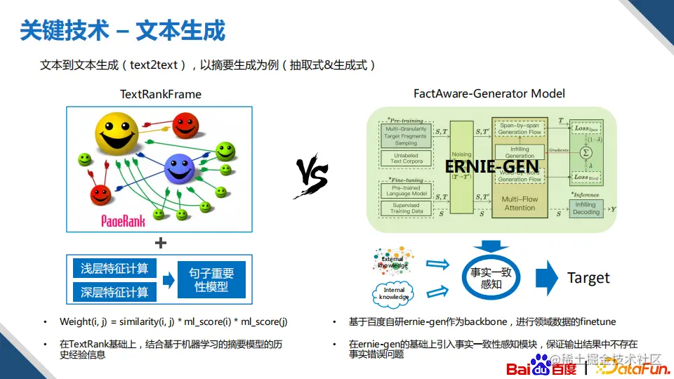 文本到文本生成,以摘要为例,摘要生成一般有两种方案,一种是抽取式,另外一种是生成式。在真实场景中,我们主要还是使用抽取式的方法。
