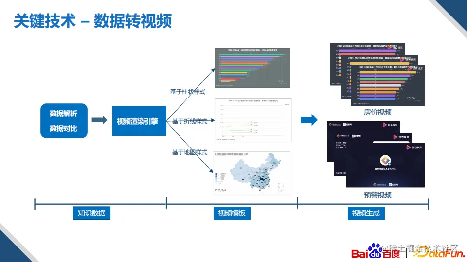 最后是数据转视频,像前面介绍的数据到文本的生成,理论上来说都可以通过视频化的方式展示。在我们的应用中,也发现视频方式展示的内容比图文更加受用户的喜爱,因此我们构建了非常多的通用的视频模板。比如上图中深圳房价动态的视频,我们可以定期获取动态更新的数据,再结合知识图谱中已有数据,就可以生成房价波动视频,从而满足用户观看的需求。