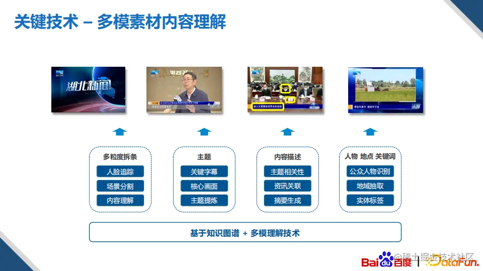 针对媒资智能管理应用场景,我们构建了多模素材理解技术。通过获取视频中的感知数据信息,然后对关键信息进行整合输出。比如跨场景的人脸追踪,可以帮助我们对视频进行多粒度的拆条,通过对这种实时资讯的抓取、理解以及检索和视频asr的解析,可以帮助我们生成编目的解析。目前,我们的方案在拆条、编目的效率上比纯人工提升了3-4倍。