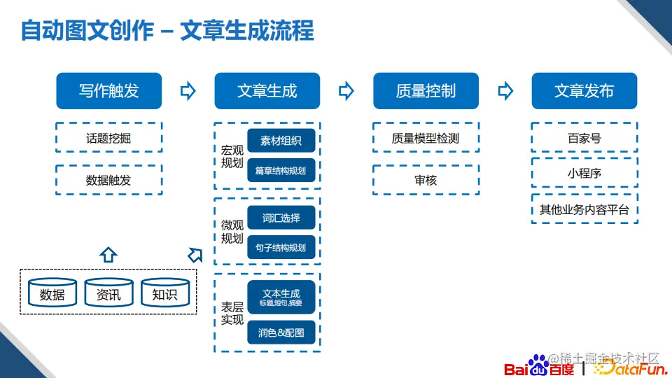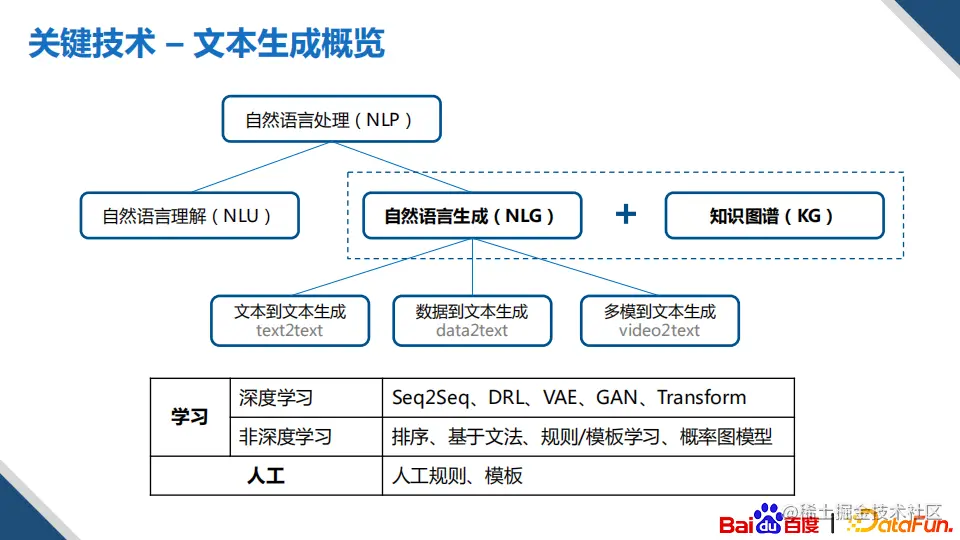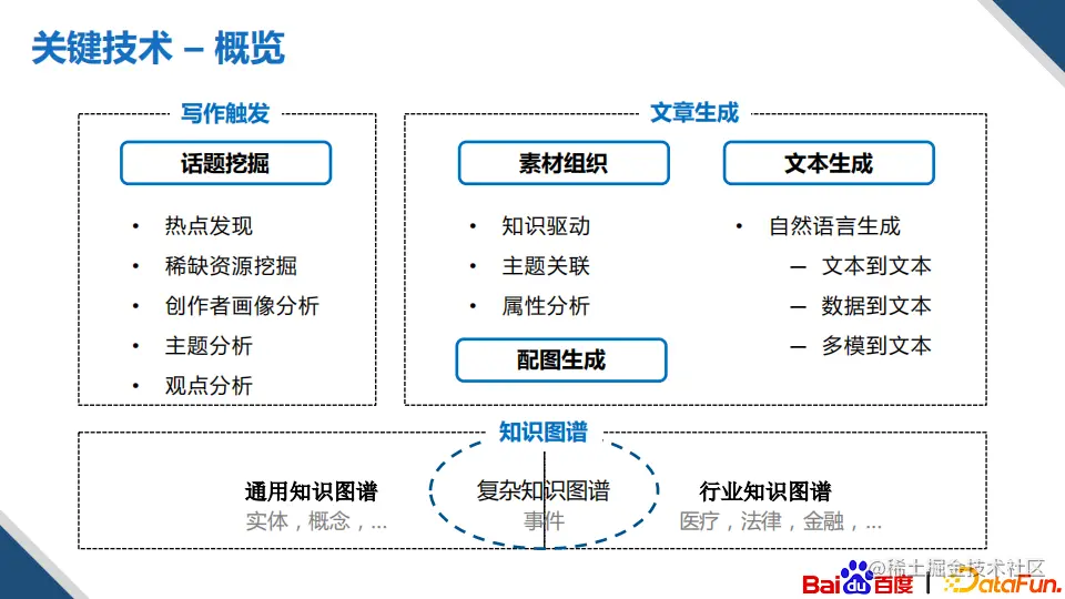 在技术概览当中,我们可以看到无论是写作触发,还是文章生成,底层都需要依赖于知识图谱作为输入,上层比较依赖于两个重要的技术方向,一个是理解,另外一个是生成。