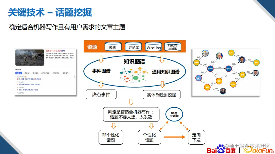 有了图谱作为基础,接下来就可以从全网域的数据中获取一些相关的咨询信息;然后我们从通用的知识图谱当中获取到对应的资讯中的实体概念,从事件图谱当中获取与资讯对应的的热门事件;接着再对这些概念和资讯进行进一步的分析和理解;最后依据写作类型,分别确定哪些话题可用,就可以得到我们的写作话题。图上的例子中,像“乌克兰”就是一个比较泛的话题,而“乌克兰局势”相对就属于比较好的话题。