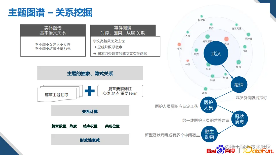 对于边关系的挖掘,我们划定了三类边关系,第一种是KG实体中的spo关系,第二种是事件之间的关系,但以上这两种关系都受限于严谨的语义关系,而创作者在选题的时候往往会需要一些比较发散的、抽象性的思考。因此我们采用隐式关系来满足这种需求,具体的做法是:首先从篇章中抽取出主题,然后对篇章的要素进行标注,比如实体、地点、以及重要的term,接下来分别从篇章数量热度、站点权重和共现位置计算这些term与主题的关系强度,再计算时效性的衰减,最后得到隐式关系的强度。