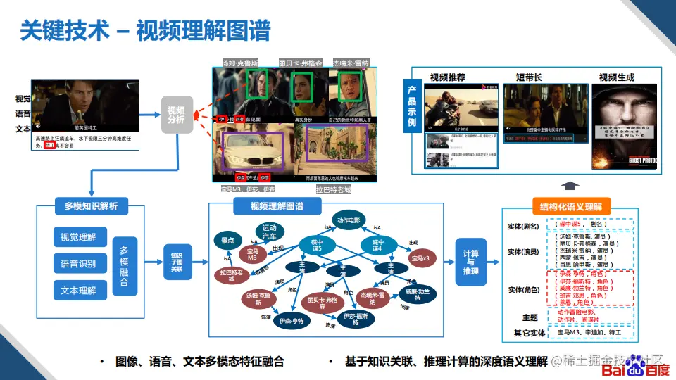 视频创作的一个关键技术是“视频理解图谱”,在以视频作为输入的场景下(也就是video2video),对视频素材的理解是进行后续生成的第一步。比如上图左上角给出的视频,如果从标题看,我们几乎得不到任何有关该视频的具体信息,但是我们通过对视频内容的感知,可以知道里面出现的演员有哪些,出现了哪些实体、地点;然后通过和知识子图进行关联就可以得到对应的影视剧的子图,对子图再进行实体地点的计算推理,就可以得到其对应的影视剧信息,后续使用视频素材就会非常容易。