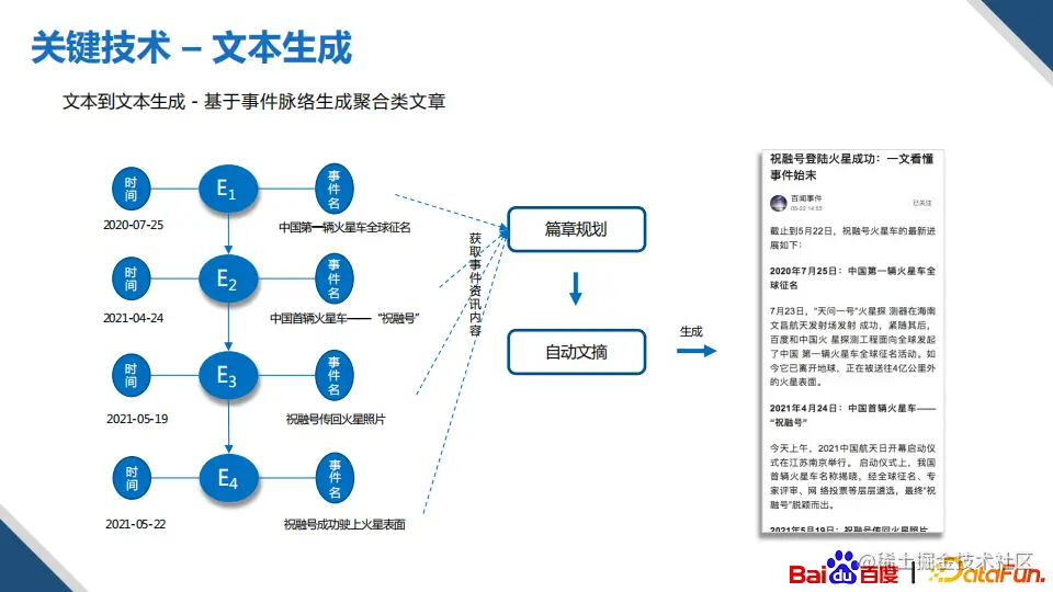 有了图谱信息和摘要生成技术,就可以做很多类型的文章了,比如上图的文章,它是一个事件脉络追溯的文章,把中国的第一辆火星车“祝融号”的来龙去脉进行了一个非常详细的盘点。
