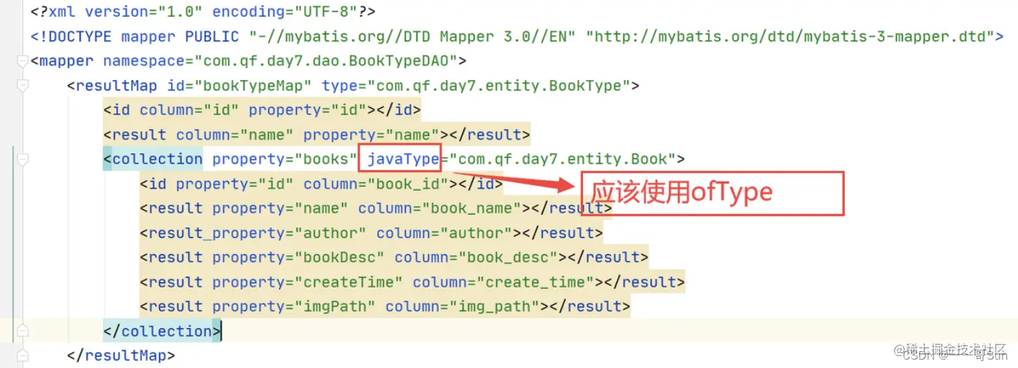 上面的 异常提示 , 是 说在 BookType类中的books属性设置有问题 。 我们来仔细查看一下代码,发现是因为直接 复制了之前的关系配置, 在配置文件中 使用javaType 节点 , 但正确的 应该 是 使用ofType。如下图所示: