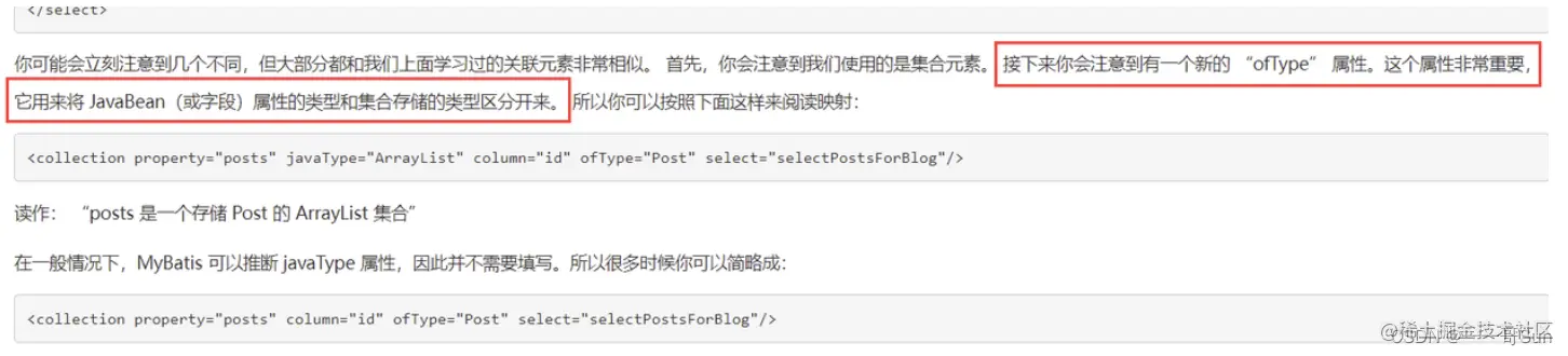这我们就不得不说说Mybatis的底层原理了!在关联映射中,如果是单个的JavaBean对象,那么可以使用javaType;而如果是集合类型,则需要写ofType。以下是Mybatis的官方文档原文: