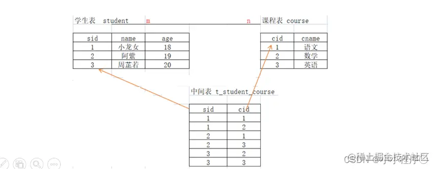 下表为多对多关系,由下表可知多对多关系的中间表至少需要2个外键