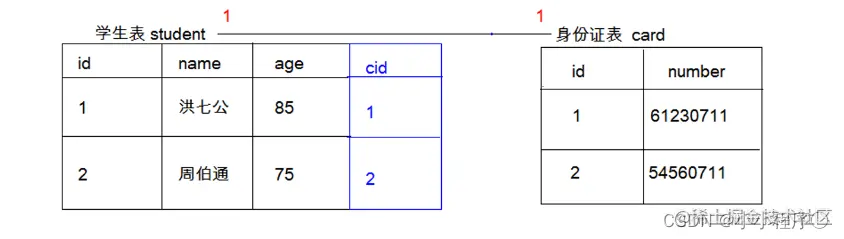 | 一对一关系:使用较少,因为一对一关系可以合成为一张表 |