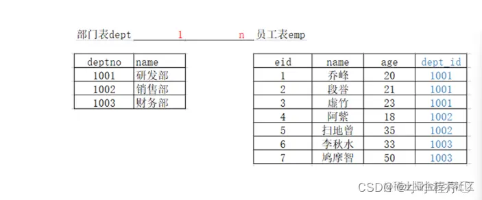 | 一对多关系:最常见的关系:学生对班级 , 员工对部门 |