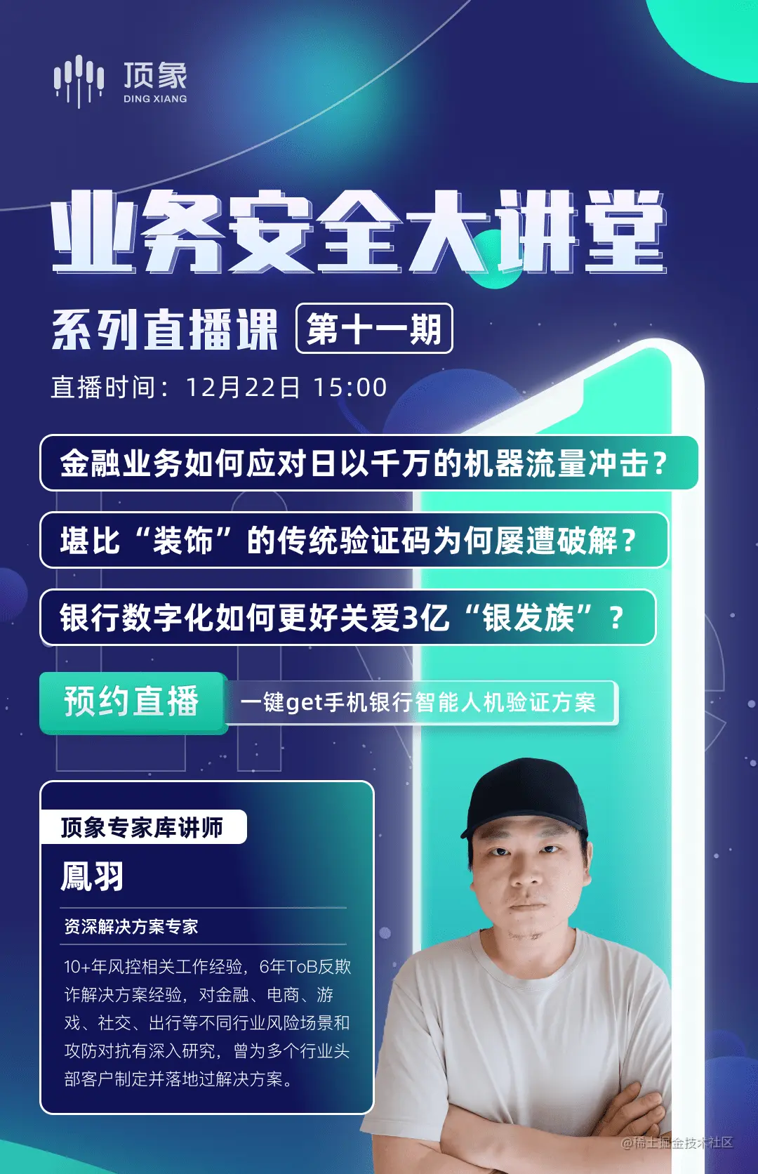 直播预告| 手机银行智能人机验证方案直播,开课啦! 顶象技术 2022-12-14 105 阅读1分钟 12月22日,顶象第十一期业务安全大讲堂系列课程即将开讲! 本期直播将由顶象资深解决方案专家鳯羽从金融业务的挑战出发,为大家深入浅出的讲解银行数字化验证场景如何满足适老化验证需求。 Tips:本期直播将在 视频号:#视频号:顶象 CSDN直播间 钉钉 B站直播间 多平台同步直播,感兴趣的同学记得一定要提前锁定直播间哦! —————— 业务安全大讲堂:立即报名
