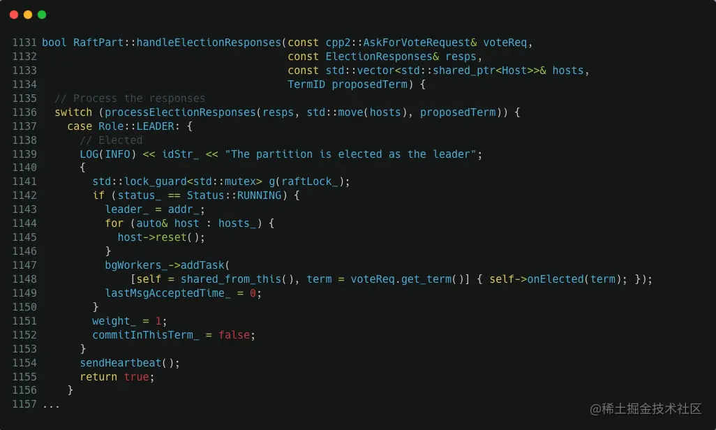 如果我们继续看堆栈上的前一个调用,可以发现 Host.reset() 调用前,RaftPart::handleElectionResponses() 在 1141 这行代码获取了 raftLock_ 这个锁,我们看 src/kvstore/raftex/RaftPart.cpp:1145 中的具体代码: