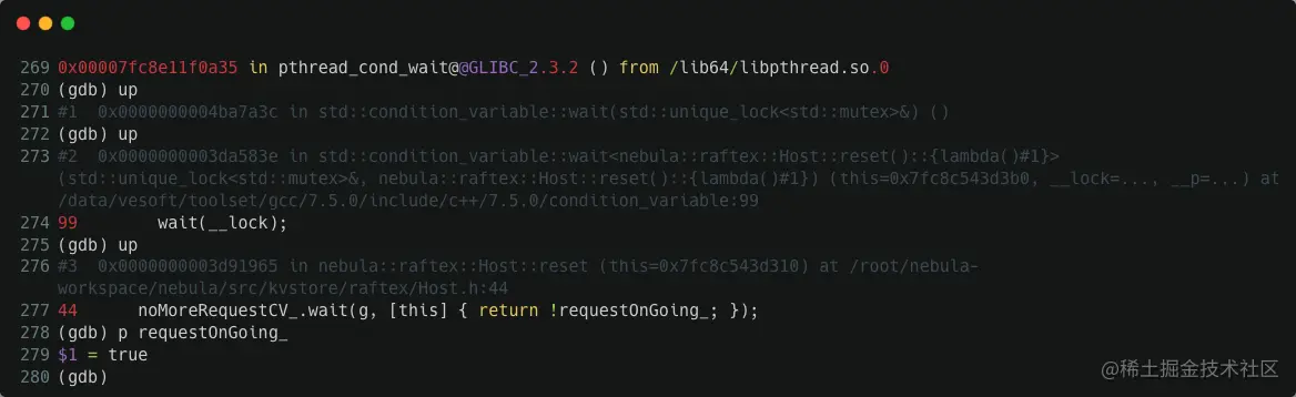 #2 0x0000000003da583e in std::condition_variable::wait<nebula::raftex::Host::reset()::{lambda()#1}>(std::unique_lock<std::mutex>&, nebula::raftex::Host::reset()::{lambda()#1}) (this=0x7fc8c543d3b0, __lock=..., __p=...) at /data/vesoft/toolset/gcc/7.5.0/include/c++/7.5.0/condition_variable:99