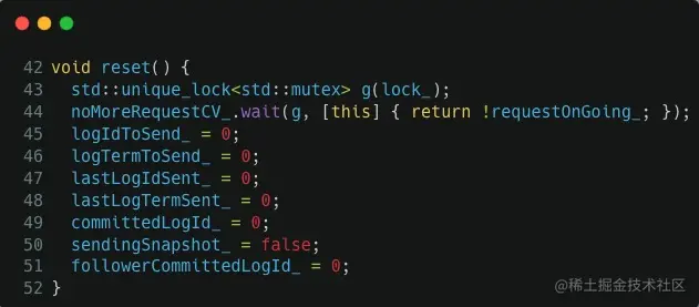 查看 src/kvstore/raftex/Host.h:44 的具体代码,通过分析我们可以知道这个函数正在等待当前所有的 append log 请求结束,也就是 44 行对应的 noMoreRequestCV_.wait() 调用,它一直在等待 requestOnGoing_ 变为 false: