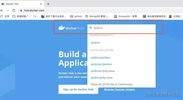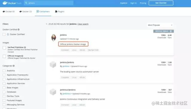 回车后发现搜索出了两万多个Jenkins镜像,我们需要官方的镜像,检查带有Official的就是官方的镜像了