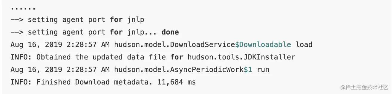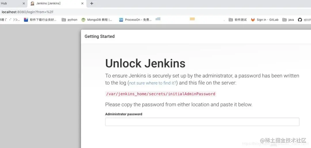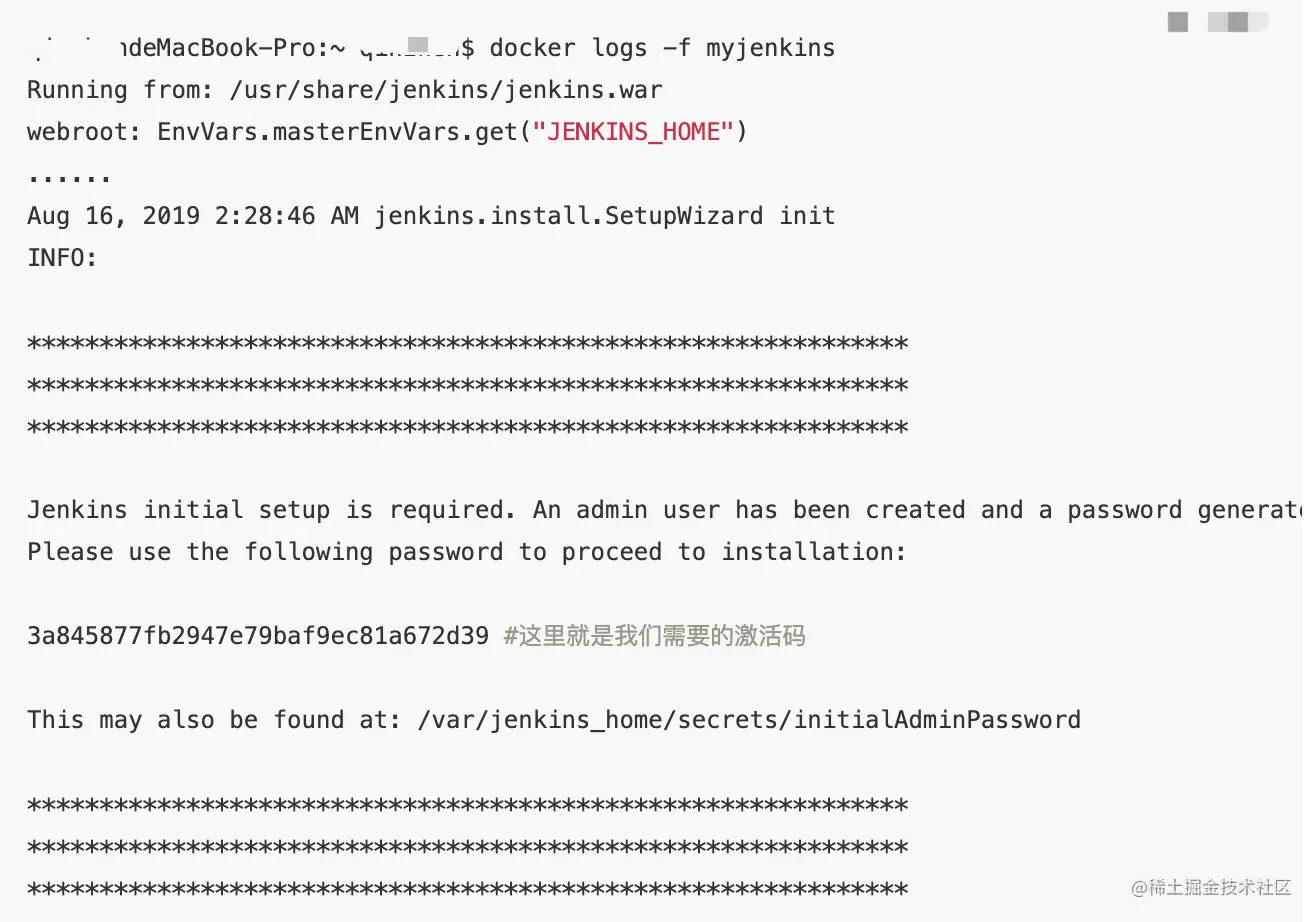 这里可以看到Jenkins服务已经成功启动,因为是最新装的,所以需要Administrator password,这个注册码在启动Jenkins时会产生,我们可以用docker logs -f myjenkins来得到jenkins的启动运行log,从中找到激活码: