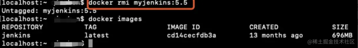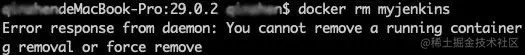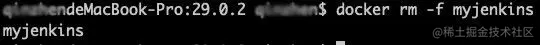 想停止容器运行的话可以使用docker stop myjenkins命令,想要删除容器的话可以使用docker rm -f myjenkins命令(-f作用为删除正在运行的容器,否则会报错)